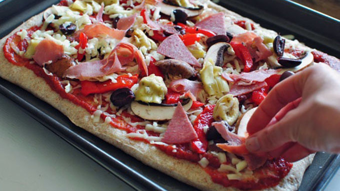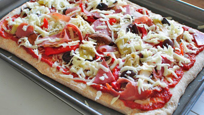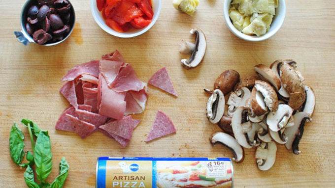 Step4Sprinkle half the cheese on top of the sauce, followed by a layer of the prosciutto, salami, olives, roasted red peppers, artichoke hearts and mushrooms.