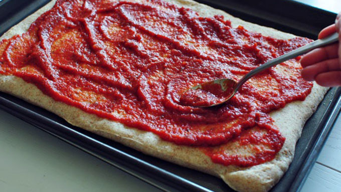 Step3Remove from oven and spoon the pizza sauce over the crust.