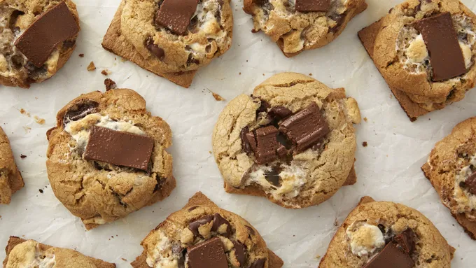 Step1First, make the cookie dough. In a medium bowl, whisk together flour, baking powder and salt. In a large bowl, cream together butter, sugar and brown sugar until light. Beat in egg, milk and vanilla extract. With the mixer on low speed or by hand, blend in the flour mixture, stirring only until no streaks of flour remain. Stir in chocolate chips.