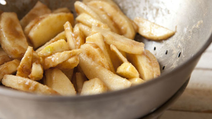Step2In a colander, toss apples with sugars, cinnamon, salt, and lemon juice. Let drain for at least 15 minutes.![]()