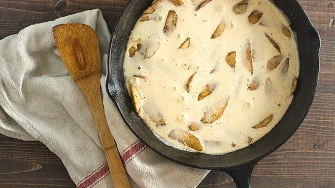Step2Add 2 tablespoons of butter to a 12-inch cast iron skillet and melt. Add apple slices and sprinkle with cinnamon. Cook, stirring often, for 2 minutes.