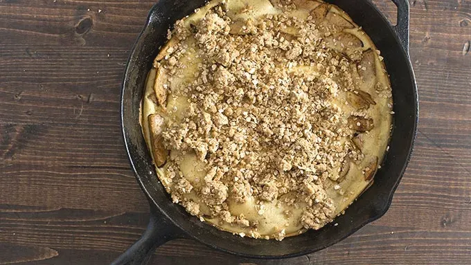 Step4While the pancake is baking, prepare the streusel by combining the remaining 1/4 cup flour, rolled oats, brown sugar, and remaining 4 tablespoons of butter. Use a fork to combine the mixture until it forms clumps and the butter is distributed throughout.