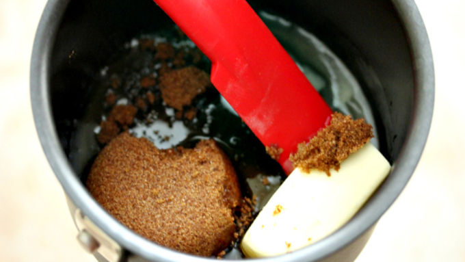 Step2In a small pot, melt butter, honey and dark brown sugar together until bubbles form around the edges.