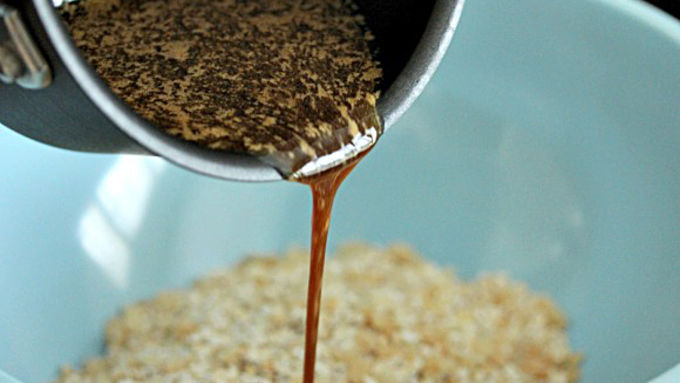 Step5In a large bowl, combine the oats and rice cereal. When the honey butter mixture is done, pour it over the bowl of oats and rice cereal.
