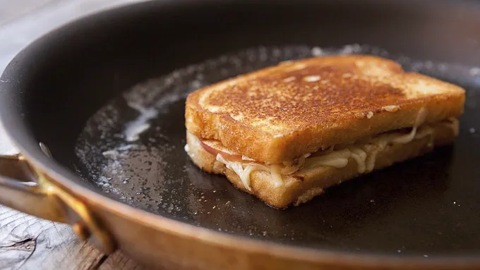 Step4Let the sandwich cook on that side for 2-3 minutes and then carefully flip the sandwich. Rotate the sandwich a bit so the melted butter in the skillet soaks into the second bread slice. Let the sandwich cook for another 2-3 minutes on the second side.