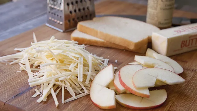 Step2Core your apple, halve it, and slice it into thin slices. Grate your cheese so it melts faster in the sandwich.