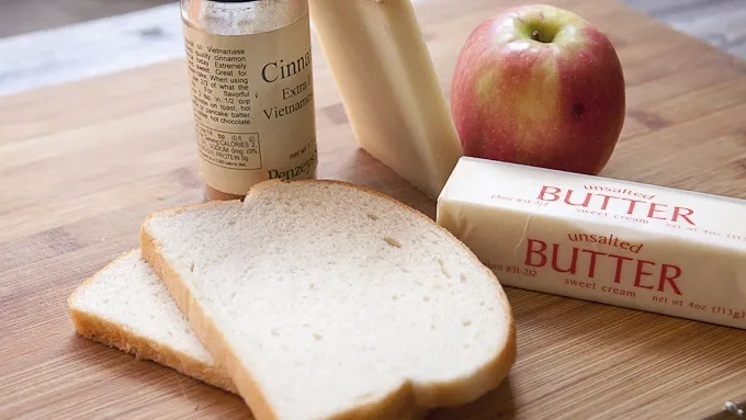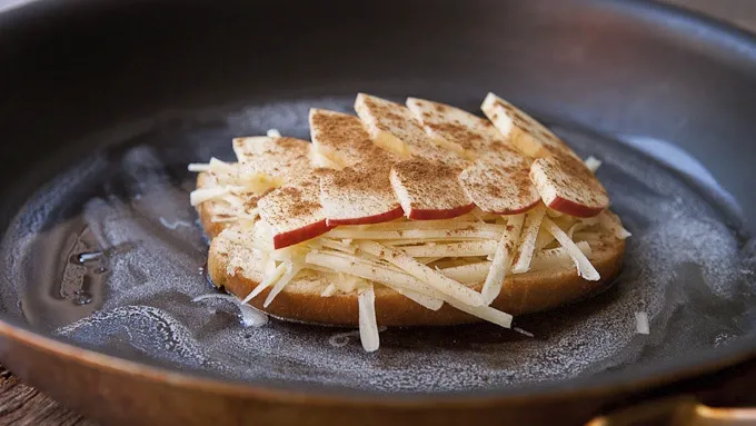 Step3Melt 1 tablespoon of butter in a large skillet over medium-low heat. Then add a slice of bread and let it soak up some of the butter. Add half of the cheese to the bread, followed by a row of apple slices. Sprinkle the apples generously with cinnamon and top with a second piece of bread.