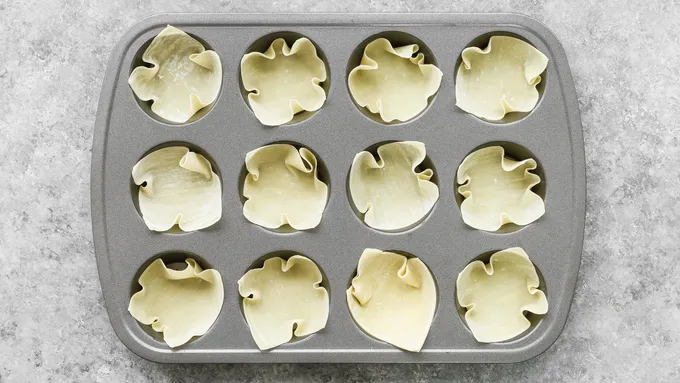 Step1Preheat oven to 350°F. Press wonton wrappers into the cups of a standard size muffin pan. Spray lightly with oil.