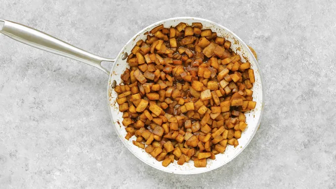 Step3Melt butter in a large skillet or saucepan over medium heat. Add diced apples, sugar, cinnamon and water. Bring to a simmer, then reduce heat to low. Taste and adjust sweetness by adding more sugar, if necessary. Let simmer, stirring occasionally, until the apple is softened, around 8 minutes. Remove apple pie mixture from heat and let cool until warm.