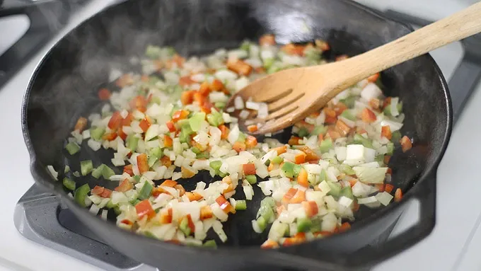 Step2In a large cast-iron skillet over medium-high heat, heat 2 tablespoons oil. Add diced bell peppers and onion. Cook 5 minutes, stirring often, until vegetables are softened. Add Italian seasoning, red pepper flakes and salt and pepper to taste. Cook 1 minute. Transfer mixture to a bowl.