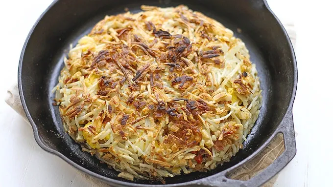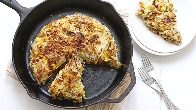 - Everything that is delicious in one skillet. Come to the table... breakfast is served! Mix 'er up and cook it all in one cast iron skillet. I don’t know about you, but for me, when it comes to breakfast I’m always torn between sweet and savory. Do I go for the pancakes doused in syrup, with extra chocolate chips? Or do I devour the hash browns with eggs and a side of a million pieces of bacon? It’s always a tough call, and I often alternate between the two when I go big with breakfast. When it’s time for the savory stuff, this hashbrown pie is perfection. It’s everything I love about the savory breakfast in one bite: Two layers of crispy shredded potatoes with scrambled eggs, crumbled bacon, melty cheese and sautéed peppers and onions stuffed in the center. These are the kind of breakfasts I get excited about the night before (#foodnerdalert, I know).