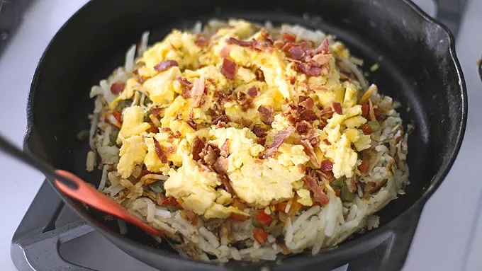 Step5Top hash browns in cast-iron skillet with pepper-onion mixture, then scrambled eggs, crumbled bacon and shredded cheese.