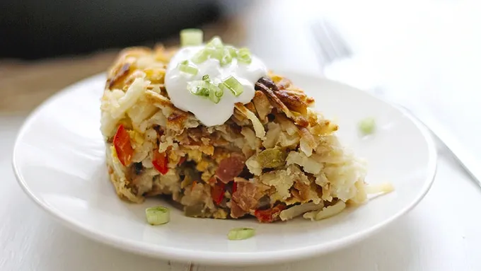Everything you love to eat for breakfast – eggs, cheese, bacon and hashbrowns – all served up in one loaded savory pie.