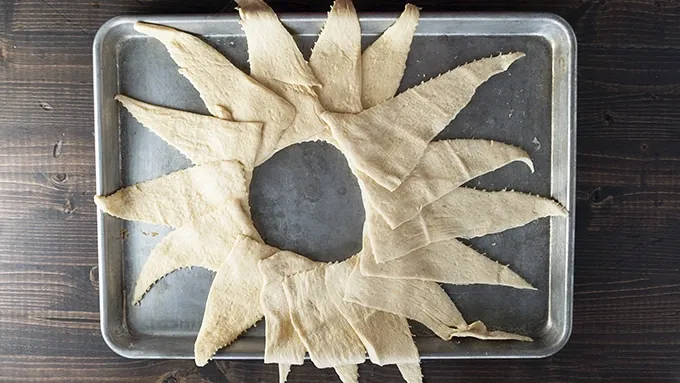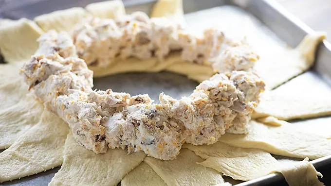 Step2Open the packages of crescent rolls and lay the long end out in a ring, overlapping them to form a base. The center circle should be about 5 inches in diameter.