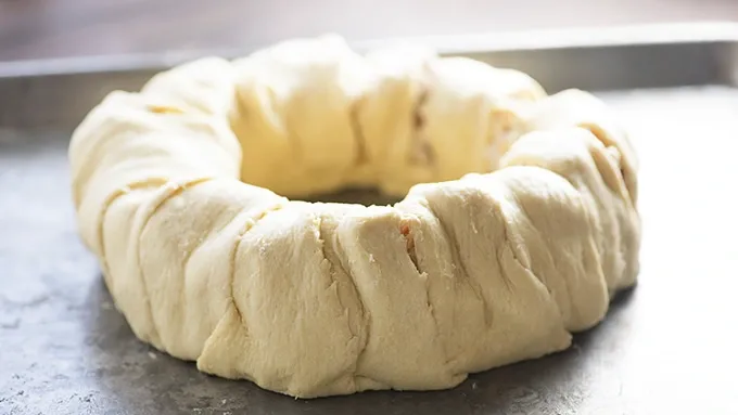 Step4Fold ends of crescent dough up and over the filling. Tuck ends underneath the ring.