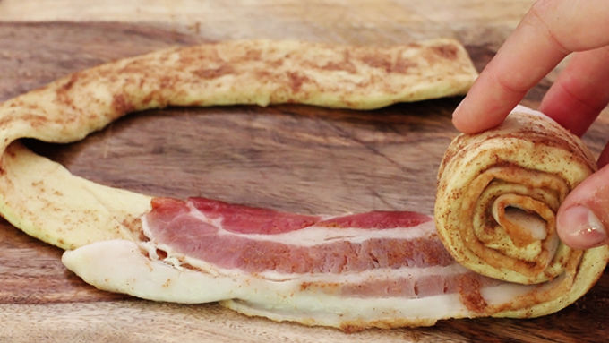 Step3Pop open the can of cinnamon rolls and unroll them into long strips. Lay one strip of bacon on each cinnamon roll strip, then roll them back up. Place each bacon roll in a greased pie pan.