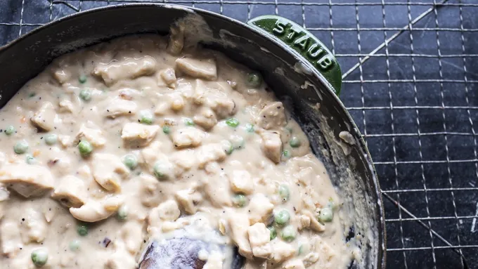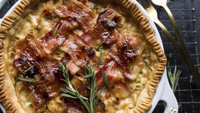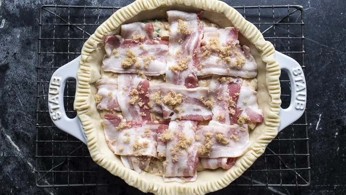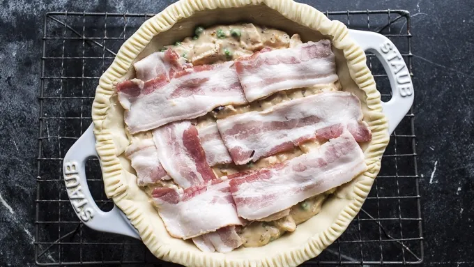 var configuration = {"title":"Bacon Pot Pie","introduction":"Cook up this simple and savory pot pie for your next meal!","servingSize":"1 Serving","image":{"small":{"media":"(min-width: 0px)","src":"https://mojo.generalmills.com/api/public/content/_bv0ZY2HG0i9NkDjExcd3g_webp_base.webp?v=d49f98db\u0026t=e724eca7b3c24a8aaa6e089ed9e611fd"},"medium":{"media":"(min-width: 500px)","src":"https://rms-media-prod.generalmills.com/fad47157-0f6e-49f4-81b7-f3b99766068a.jpg"},"large":{"media":"(min-width: 767px)","src":"https://rms-media-prod.generalmills.com/fad47157-0f6e-49f4-81b7-f3b99766068a.jpg"},"alt":"Bacon Pot Pie"},"contributor":{"label":"by:","name":"Half-Baked Harvest","displayDate":{"label":"Updated","date":"May 11, 2017"}},"ingredientGroups":[{"ingredients":[{"quantity":"3","description":"tablespoons butter"},{"quantity":"1","description":"lb button mushrooms, sliced"},{"quantity":"2","description":"carrots, peeled and chopped"},{"quantity":"2","description":"thyme sprigs"},{"quantity":"3","description":"tablespoons flour"},{"quantity":"1/2","description":"cup white wine"},{"quantity":"2","description":"cups milk"},{"quantity":"","description":"Pinch of cayenne pepper"},{"quantity":"1 1/2","description":"cups frozen peas"},{"quantity":"","description":"1-2 cups chopped or shredded chicken"},{"quantity":"1/3","description":"cup Parmesan cheese"},{"quantity":"1","description":"crust from 1 box (14.1 oz) refrigerated Pillsbury™ Pie Crusts (2 Count)"},{"quantity":"8","description":"slices thick cut bacon"},{"quantity":"1","description":"tablespoon brown sugar"},{"quantity":"","description":"Rosemary, for serving (optional)"}]}],"steps":[{"description":"Preheat oven to 400°F. Lightly grease an 8-9 inch pie plate."},{"description":"Heat a large skillet over medium heat. Add butter. Once melted, add mushrooms and carrots. Cook for 5-8 minutes or until carrots are soft. Stir in fresh thyme and cook another minute. Add flour and continue cooking a minute longer. Slowly pour in wine and milk, whisking to ensure that no clumps form in sauce. Bring sauce to a low boil. Reduce heat and stir in cayenne pepper, peas and cooked chicken. Simmer sauce for 5 minutes or until thickened. Remove from heat and let cool. Stir in the Parmesan cheese.","stepShotImageUrl":"//mojo.generalmills.com/api/public/content/YncJtqCghECXEI8FMpHYOQ_webp_base.webp?v=286892aa\u0026t=3653fe2f5ecd4a47a5a51c97e429947c"},{"description":"Unroll the pie dough and use your hands to fit it into the pie plate. Using a fork, crimp around the edges. Pour the pot pie filling into the crust.","stepShotImageUrl":"//mojo.generalmills.com/api/public/content/Cokuq8oPtEumyAYXN6FEhQ_webp_base.webp?v=a1fcf2ba\u0026t=3653fe2f5ecd4a47a5a51c97e429947c"},{"description":"Weave a lattice with 8 bacon slices (4 in one direction and 4 in the other—keep them lengthened as long as possible because they’ll shrink when they cook). I found thick cut bacon worked best.","stepShotImageUrl":"//mojo.generalmills.com/api/public/content/Ifb23j3-vEWkd1aJWX8fsw_webp_base.webp?v=ecbd9a56\u0026t=3653fe2f5ecd4a47a5a51c97e429947c"},{"description":"Sprinkle bacon with brown sugar. Place pie on a baking sheet and bake for 25-35 minutes or until the filling is bubbling and the bacon is crisp. If the crust starts to get too brown before the bacon is crisp, cover the edges of the pie with foil.","stepShotImageUrl":"//mojo.generalmills.com/api/public/content/US_vWVfTkU64KKKcTV8b-w_webp_base.webp?v=21754f8e\u0026t=3653fe2f5ecd4a47a5a51c97e429947c"},{"description":"Serve hot with fresh rosemary. Enjoy!","stepShotImageUrl":"//mojo.generalmills.com/api/public/content/xzYnFLU5LUClVv-sAeS4JQ_webp_base.webp?v=a4538049\u0026t=3653fe2f5ecd4a47a5a51c97e429947c"}],"tips":[{"title":"","description":"If you have leftover holiday turkey, use this in place of the chicken.","category":"Recipe/Ingredient Facts","tipShots":[]},{"title":"","description":"You can use any assortment of veggies in this pot pie.","category":"Variation","tipShots":[]},{"title":"","description":"For an extra kick, sprinkle the bacon with a mix of brown sugar and cayenne pepper!","category":"Presentation/Garnish","tipShots":[]},{"title":"","description":"Is there anything cozier than a pot pie?\r\n\r\nI could not think of a better meal for this time of year. It’s perfect for a crowd or just a simple family dinner. The bacon lattice top crust is also a really big hit! I mean, obviously.\r\n\r\nDecember is a busy month for me, to say the least—I think it is for everyone. I have family coming to town in 10 short days and I’m running around like a turkey with its head cut off trying to get in work and Christmas shopping before everyone arrives. This means dinner needs to be quick and simple.\r\n\r\nEnter this pot pie. Not only is it delicious, but also it comes together in no time and is always a huge it with my family. Like I said though, I think it’s that bacon crust—it gets them every time!\r\n\r\nServe the pie warm, with a sprinkle of fresh rosemary if desired.\r\n\r\n","category":"Editorial","tipShots":[]}],"kitchenTips":[{"title":"","description":"If you have leftover holiday turkey, use this in place of the chicken.","category":"Recipe/Ingredient Facts","tipShots":[]},{"title":"","description":"You can use any assortment of veggies in this pot pie.","category":"Variation","tipShots":[]},{"title":"","description":"For an extra kick, sprinkle the bacon with a mix of brown sugar and cayenne pepper!","category":"Presentation/Garnish","tipShots":[]}],"additionalContent":[],"faq":[],"tipCategories":[{"categoryName":"Editorial","heading":"More About This Recipe","cssClass":"recipePartStory","expandOnInit":false,"expandText":"More +","collapseText":"Less -","expandEventName":"","collapseEventName":"","image":"","tips":[{"title":"","description":"Is there anything cozier than a pot pie?\r\n\r\nI could not think of a better meal for this time of year. It’s perfect for a crowd or just a simple family dinner.