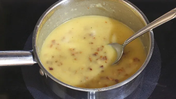 Step2Heat a medium saucepan over medium-high heat and fry the bacon until crispy. Drain all but a tablespoon of the bacon grease and stir in the flour. Add the chicken broth and bring it to a simmer, stirring until thickened to prevent lumps.