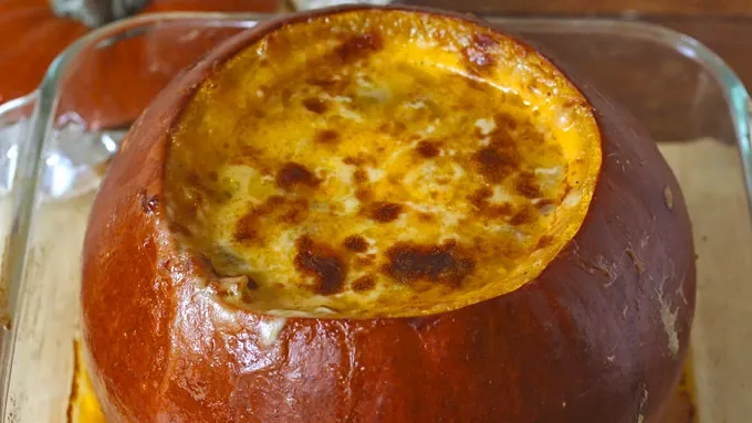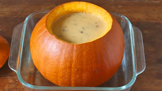 Step4Place the pumpkin in a casserole dish (to catch any leaks). Pour the dip into the pumpkin. Cover the pumpkin loosely with aluminum foil and bake for 50 minutes or until the pumpkin is tender. Remove the foil and continue to bake for another 20 minutes or until the cheese is bubbly and beginning to lightly brown on top.