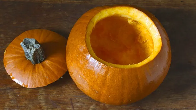Step1Preheat the oven to 375°F. Cut the top off the pumpkin. Spoon out the seeds and clean out the inside of the pumpkin.