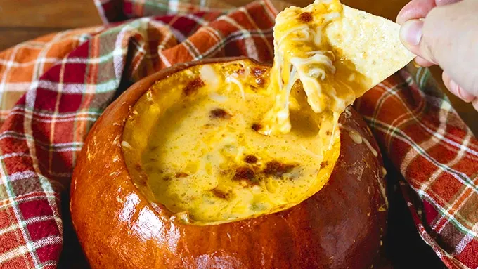- Why use a bowl when you can bake this cheesy bacon dip right in a pumpkin? This hot, cheesy, bacon queso is spiced with green chiles and smokey chipotle peppers for a dip with a kick! Part of what makes food enjoyable is presentation. Here's a delicious dip that's served inside of a whole pumpkin – what a fun party appetizer for the holidays! This dip is super cheesy with tons of savory bacon, diced green chiles and some chopped chipotles for a wonderful smoky flavor with a little kick. The walls of the pumpkin it's baked inside will keep the dip nice and hot. Chipotle chilis are a key ingredient to add spice and smokiness. Chipotles can be found in the Hispanic section of well-stocked grocery stores, at your local Hispanic grocer, or online. So grab yourself a sugar pumpkin, fill it with this luscious dip, bake and serve at your next party for an appetizer your guests will love!