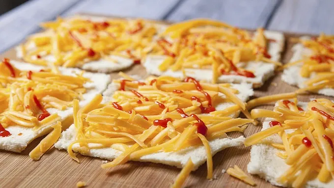 Step2Cut crusts off pieces of bread and flatten with a rolling pin. Sprinkle each flattened piece with cheddar cheese and a drizzle of sriracha sauce.