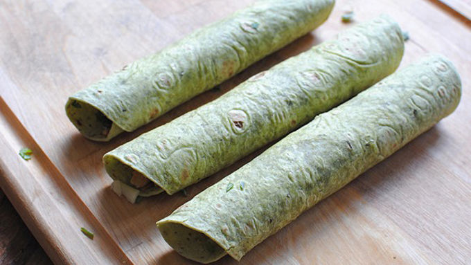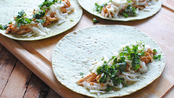 Step2Spoon a little of the chicken filling close to edge of each tortilla, leaving about an inch at one side. Top the filling with shredded cheese and cilantro. Gently roll up each tortilla and place them on a baking sheet seam side down.