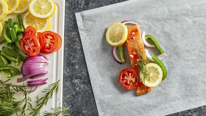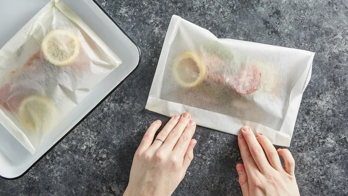 Meaning “enveloped in paper,” en papillote is a method of cooking where food is covered in parchment paper before being cooked in an oven. The envelope keeps the steam trapped inside, resulting in deliciously moist and tender food. This recipe will give you the basics for cooking fish in parchment paper, but our favorite filet to prepare this way is juicy salmon.