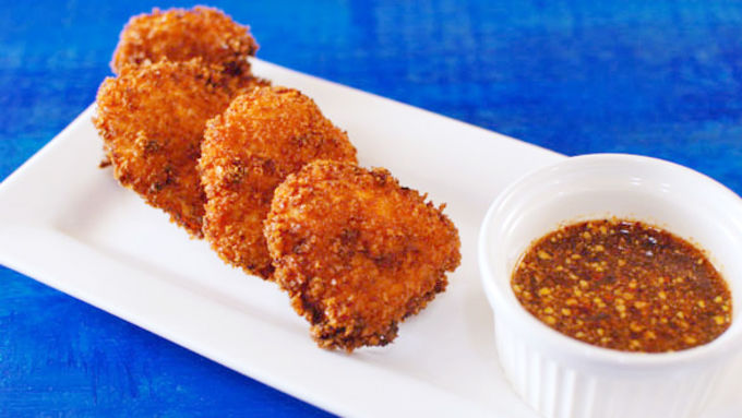 Super quick and simple to make, the marinade is whipped up in two minutes and the chicken is left to do its marinating while you go about your work or fun. Then the chicken is dipped in flour, egg and breadcrumbs and slid into the oven. You’re done! Then all you have to do is pull out your favorite sweet-hot Asian dipping sauce and enjoy.