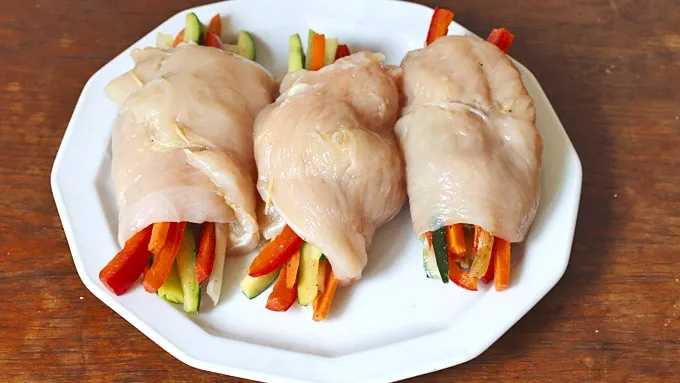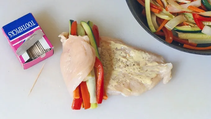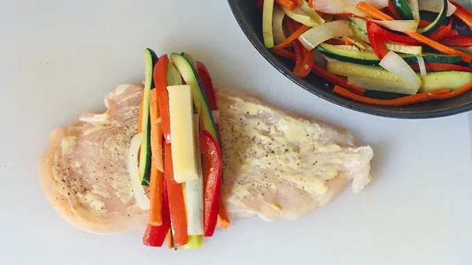 We've got tender chicken filets that are rubbed down with Dijon mustard, stuffed with sweet bell peppers, buttery leek, healthy zucchini, crisp carrots, and tangy Swiss cheese, then pan-seared to a luscious golden brown and drizzled with a balsamic-rosemary-mustard glaze. Sound good? They're amazing!