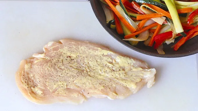 Spread each chicken filet with some Dijon mustard and sprinkle with salt and pepper.