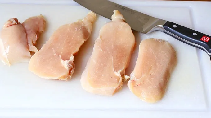 For the chicken rolls, using a very sharp knife slice 3 full filets out of each chicken breast. Cutting the chicken while it's still semi-frozen will help make it easier to cut.