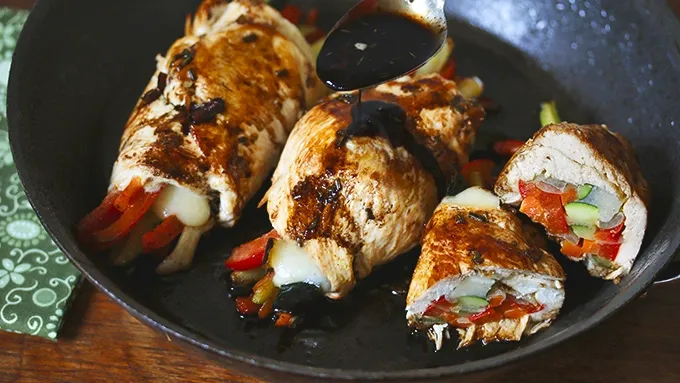 Boring weeknight dinners just got an upgrade. We thinly sliced chicken, wrapped it around fresh, colorful vegetables then added cheese for good measure and drizzled the whole dish with a decadent balsamic glaze.