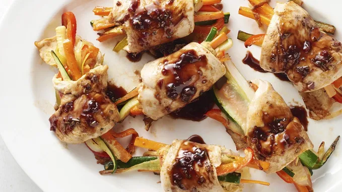 Tender steak rolls filled with zesty vegetables and drizzled with a glaze that is simply out-of-this-world delicious.