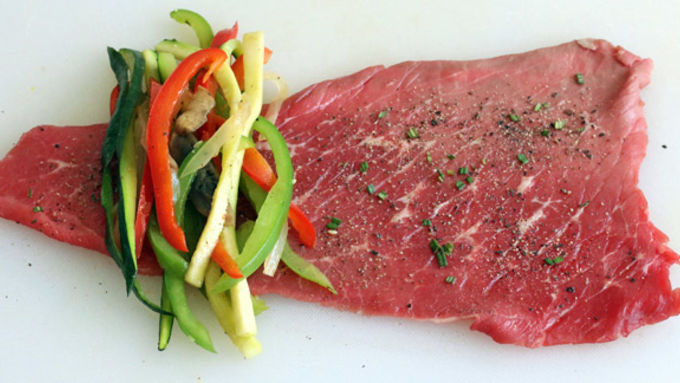 Step3Place a few of the vegetable strips vertically on one end of each steak cutlet so that once rolled up the end of the vegetables are sticking out of each end of the steak roll.