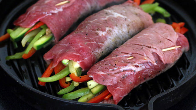 - One of my favorite German dishes is called Rouladen. Tender strips of beef are smeared with mustard, strewn with salt and freshly ground black pepper, and stuffed with onions and bacon, then rolled up, pinned with toothpicks, fried until browned, and simmered in a delicious gravy. This dish is an Italian-inspired version. Tender cuts of beef are rubbed down with olive oil, freshly ground black pepper and chopped rosemary, then stuffed with strips of sautéed bell peppers, onion, zucchini, and mushrooms. They're rolled up, grilled, and then drizzled with a balsamic vinegar glaze that is infused with garlic, fresh rosemary, and a touch of brown sugar. The result: molto delizioso! These rolls are quick to assemble and prepare once you have the prep work of chopping the vegetables and making the glaze done, both of which can be performed hours in advance. The rolls are perfect when grilled outside, and fried indoors in a pan or a ribbed cast iron skillet. I live in Washington state, so guess what I opted for? You got it. Who wants to grill outside when it's raining? Let's just say that I make good use of my ribbed cast iron skillet. The glaze is out-of-this-world amazing. Drizzled over these grilled steak rolls, you're going to fall in love – and so will your lucky guests.