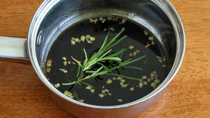 Step5For the rosemary balsamic glaze: Heat the olive oil in a small saucepan over medium-high heat. Add the garlic and cook for one minute, until fragrant. Add the balsamic vinegar, red wine, brown sugar and the rosemary sprigs and bring to a rapid boil. Reduce the heat and simmer uncovered for 5 minutes. Add the broth, return to a boil, reduce the heat to low and simmer for another 15 minutes. Discard the rosemary sprigs.