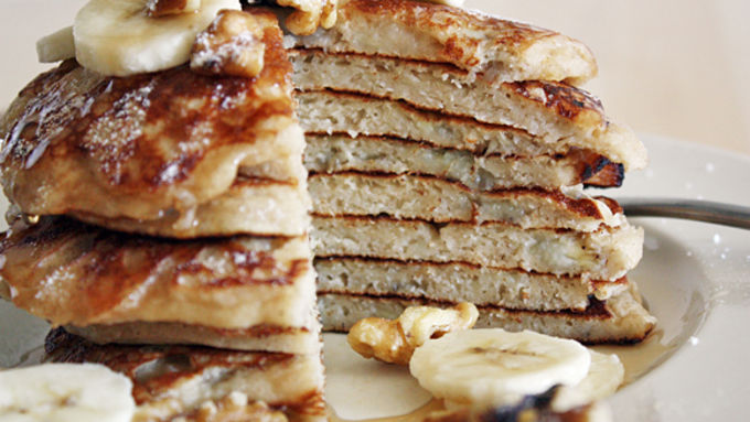 Step5Top pancakes with chopped walnuts, banana slices, maple syrup and/or powdered sugar, if desired. Serve immediately.