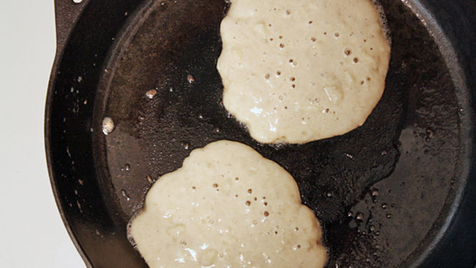 Step4Ladle slightly less than 1/4-cupfuls of batter onto skillet. Cook until edges are dry and bubbles form on top. Flip and cook other side until golden brown. Add more butter to skillet as needed to keep it coated.