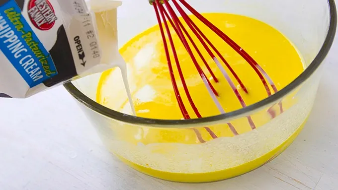 Step1In a large bowl, dissolve gelatin into water. Quickly whisk in cream, banana liqueur, and rum. Add food coloring and whisk until combined.