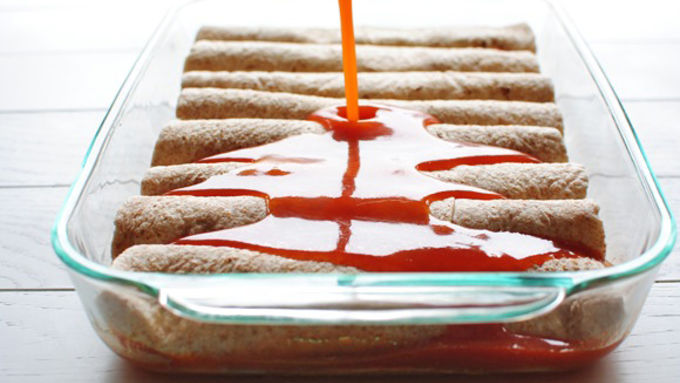 Step3Preheat oven to 350°F. Pour 1/2 cup of the enchilada sauce in the bottom of a 9x13-inch baking dish, spreading it evenly across the bottom of the dish. Evenly divide the beef among the 8 tortillas. Sprinkle with the diced bell pepper. Roll each enchilada up and place in the dish, seam-side down. Pour the remaining enchilada sauce over the enchiladas. Sprinkle with cheese.