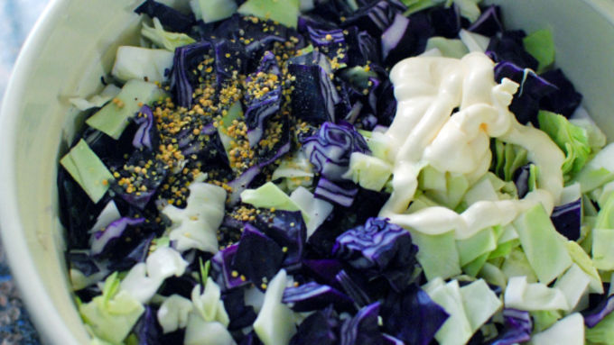 Step3Make the slaw: Chop the cabbage and mix with the rest of the slaw ingredients. Allow to marinate for at least a half hour before serving.