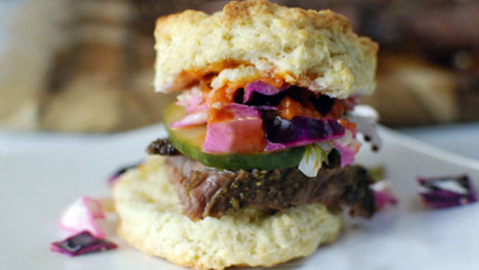 Step7To serve, slice the brisket into thin slices against the grain. Cut the biscuits in half and spread on some BBQ sauce. Top with the meat, slaw, and pickles and eat!