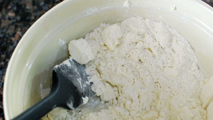 Step4Make the biscuits: Chop the butter into small cubes and freeze for 20 minutes. Mix the dry ingredients. Stir in the butter. Stir in the buttermilk slowly, only adding as much as needed to bring the dough together.