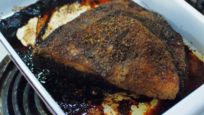 Step2Put the beef into the oven at 215°F and cook for about 6 hours until tender and cooked through. ABOUT THE BRISKET: This dry cooking method will not produce the super tender falling-apart brisket you are familiar with at a BBQ spot. However, as long as your brisket has a nice thick fat layer on top, it should produce a tender enough, juicy piece of meat that can be sliced nicely and has a decent smoke flavor from the salt. So make sure your brisket has that fat layer and make sure you cook it fat side up!