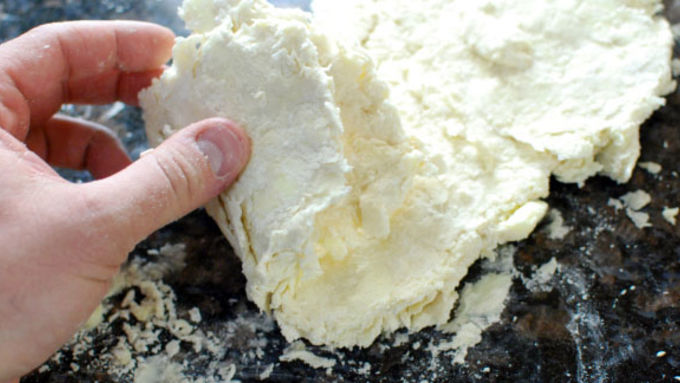 Step5Roll out the dough into a rectangle, then fold it like a wallet. Roll this out again and repeat until you have done this three times. This will help add to that nice flaky texture we are looking for.