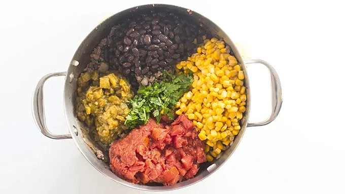 Step2Drain liquid from pan. Add the taco seasoning, tomatoes, corn, chiles, beans, cilantro and chicken broth to the pot and stir to combine.