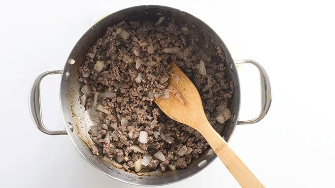 Step1In a large soup pot or Dutch oven over medium heat, brown the ground beef, breaking meat up as it cooks. Add onion and garlic. Continue cooking until beef is cooked through and no longer pink.