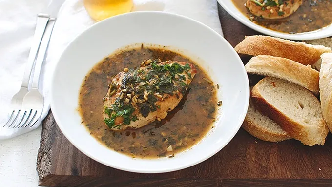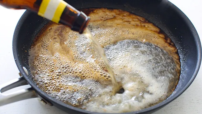 - Seared chicken swimming in an ocean of beer and garlic. Shut up, right? This is the perfect weeknight meal. It's super quick, super rich in flavor and involves a beer. Win win win. Sometimes I make this with shrimp, sometimes with chicken. But the main thing is to bake some delaarrrrshush crusty bread to sop up all the beer sauce. But the sauce is straight ridic. It's like, beer with grainy mustard, fresh lemon juice, Worcestershire sauce and HONEY. Ugh. And so much garlic not even Edward Cullen could find you. Wait, maybe lessen the garlic because he's fiiiine. Don't forget your bread for sop sop soppin'. That's right. You could roast or sauté some veggies to go with it. And then invite me over, coo?