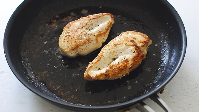 Step2Heat 1 tablespoon butter and the oil in a large sauté pan over medium-high heat. Season the chicken with salt and pepper and place in the pan. Sear for 5 minutes on one side, flip and sear another 5 minutes. Remove chicken from the pan.
